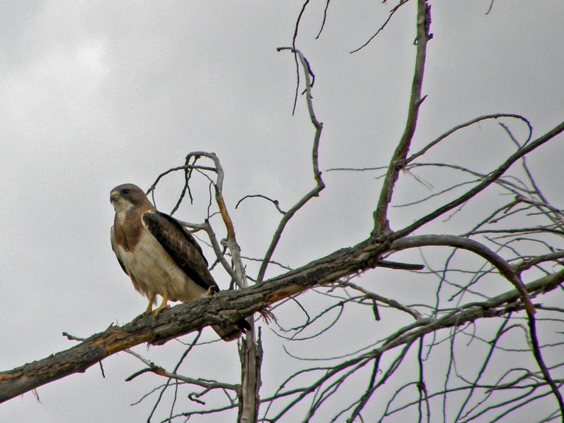 Swainson's hawk is a large hawk 18-22 inches in length with a wingspan of four feet. It is dark brown above with a lighter brown chest and a white belly. It has a short, hooked bill and slightly pointed wings. When it is perched, its wings extend beyond its tail.