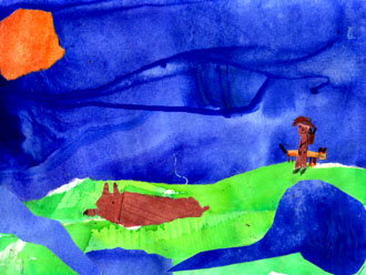 Coyote started to trot over to where he could camouflage. Unfortunately the hunter still saw him. Shaft after shaft pierced the ground in front of Coyote. Each one had a strange metal tip at the end. So Coyote backed off slowly. Then BAM! Coyote broke into a trot then into a gallop. Shaft after shaft stabbed the dirt behind the racing paws of Coyote. All of a sudden SPLASH! Coyote jumped into the river and swam away.