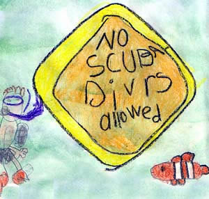 The sign said “No Scuba Divers Allowed.” Teddy was not sad because he had special powers. He turned himself into…