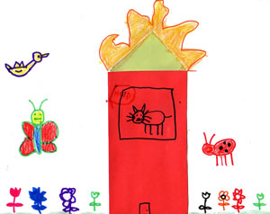 a kitten crying for help. He was stuck in the tall house which was on fire. The three friends decided to help the poor little kitten.