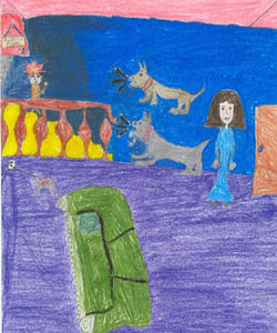 When Lucy's car drove into Acro Street, Austin was worried that Lucy would be mean like the other babysitters that he had. Like Ms. Artrubo, she doesn't like children at all, and she always brought her, two dogs with her. When Mrs. Brunet went in her car and ms. Artrubo opened the door, her two dogs Mean and Greedy chased Austin into his room until Ms. Artrubo went home with Mean and Greedy.