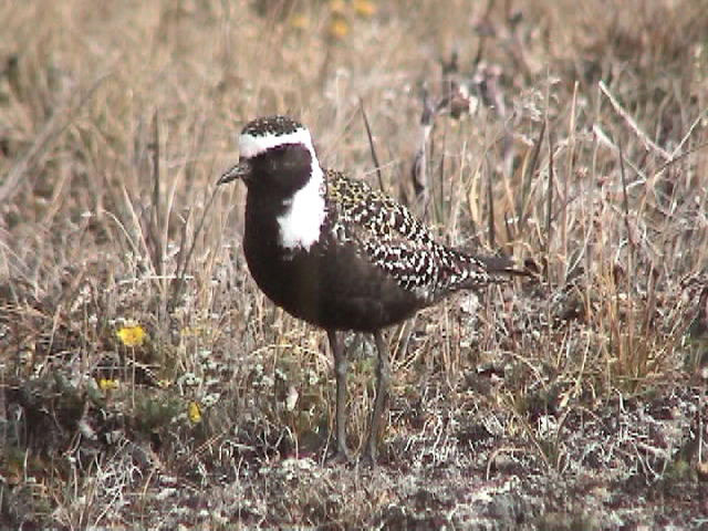 The American golden plover is a medium-sized bird. It is 9-11 inches in length with a wingspan of 22 inches. It has long legs; a short, pointed black bill; and a small, round head. Its wings extend beyond its tail when they are folded. It has a black and golden-yellow speckled back and a grayish-brown breast, neck, and sides. During breeding season, its breast, face, throat, and belly are brownish-black, and it has a white stripe running from its forehead down the back and sides of its neck. Males and females look similar, but the male is more brightly colored. The American golden plover looks similar to the black-bellied plover, but the American golden plover doesn't have a white rump or wing stripe.