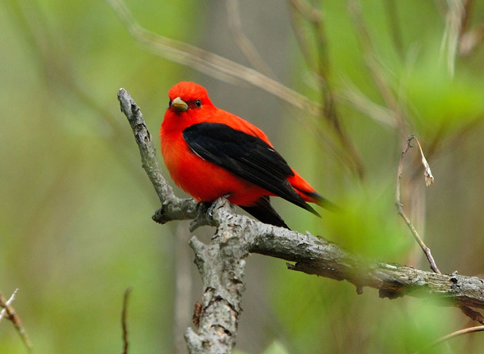 Despite the male scarlet tanager's bright-red color, it is not easy to spot a scarlet tanager because they spend most of their time high in the forest canopy.