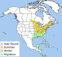 North America. In the winter, it is found in montane evergreen forests on the eastern side of the Andes Mountains in South America.
